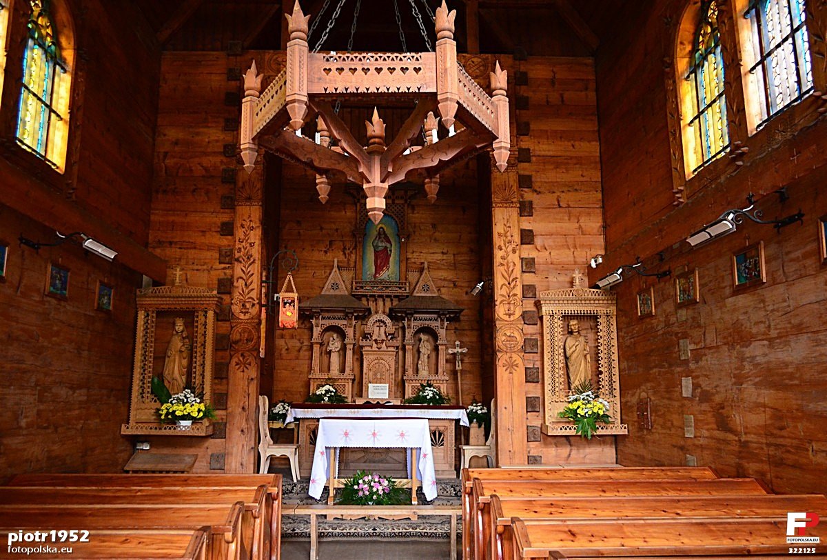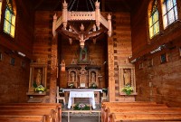 Kaplica Najświętszego Serca Jezusa więcej zdjęć (59) Architekt: Stanisław Witkiewicz Wykonawcy: Stanisław Bobak , Tomasz Bobak , Maciej Stoch , Szymon Lasak Inwestor: Witold Uznański Atrakcja turystyczna Zbudowano: 1904-1905 Zabytek: A-706 z 15.11.1993 Kościół p.w. Najświętszego Serca Pana Jezusa z lat 1904 – 07. Zbudowany z fundacji Witolda Uznańskiego, wg projektu Stanisława Witkiewicza. Projekt Witkiewicz oparł na dekoracjach ludowych zakopiańszczyzny i poszukiwaniach stylu w duchu nurtu narodowo – romantycznego. Pracę miejscowych cieśli nadzorował Aurelian Blacha. Restaurowana w latach 1978 – 81 pod kierunkiem Antoniego Nowotarskiego. Budowa i wyposażenie. Kościół drewniany konstrukcji zrębowej. Reprezentujących tzw. styl zakopiański. Do budowy nie użyto ani jednego metalowego gwoździa. Zbudowany na wysokiej granitowej podmurówce, otoczony arkadowymi podcieniami. Prezbiterium mniejsze od nawy, prostokątnie zamknięte z boczną zakrystią. Dach dwukalenicowy, kryty gontem z ozdobnym szczytem o motywie wschodzącego słońca i niewielką czworoboczną wieżyczką. Mieszczącą dzwon z 1907 r. i zwieńczoną metalowym krzyżem. Sklepienie o przekroju trapezu. Drzwi i ramy okienne bogato rzeźbione. W oknach kolorowe witraże (wg projektu Witkacego) z wizerunkiem MB Częstochowskiej, MB Ostrobramskiej, herbem Polski (Orzeł w Koronie) i herbem Litwy (Pogoń). Ołtarz główny w kształcie góralskiej chaty wg projektu inżyniera Blachy. Ołtarze boczne z lat 50 XX w. Ciekawe stacje Drogi Krzyżowej, namalowane na szkle przez Jana Jachymiaka w 1954 r. Dębowy żyrandol wykonany przez Józefa Janosa z lat 40 XX w. kosciolydrewniane.pl ul. Jaszczurówka więcej zdjęć (91) |