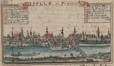 1763 , Panorma Opola widziana z dzisiejszego Zaodrza według rysynku Friedricha Bernharda Wernhera z jego dzieła "Silesia in Compendio seu Topographia das ist Praesentatio und Beschreibung des Herzogthums Schlesiens [...] Pars I". |