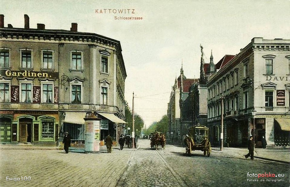 Lata 1899-1908 , Dzisiejsza Al.Korfantego (dawn. Schloss Strasse), widok z Rynku. Zdjęcie pochodzi z profilu "Pozdrowienia z Katowic" na FB.Skomentuj zdjęcie