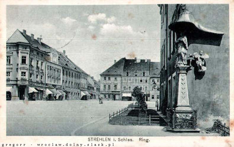 26 pobrań 6436 odsłon 6 średnia ocen Poprzednie i następne zdjęcia gregorr Obiekty widoczne na zdjęciu Pierzeja północna więcej zdjęć (43) Ratusz więcej zdjęć (112) Zbudowano: XIV w. Dawniej: Rathaus Zabytek: - Ratusz powstał prawdopodobnie na początku XIV wieku w miejscu dużego domu kupieckiego. Ratusz został przebudowany w stylu wczesnorenesansowym w latach 1520-1526. W 1548 ratusz spłonął. Odbudowany został w stylu renesansowym w 1564 roku. W 1619 częściowo spłonęła wieża ratuszowa. Rok później została odbudowana. W 1648 runęła wieża, uszkadzając budowlę. W 1706 ratusz uległ częściowemu spaleniu. Ratusz odbudowano, ale wieża na renowację czkała aż 13 lat. W 1817 budowla została uszkodzona uderzeniem pioruna. W ramach odbudowy, obniżono wieżę i pozbawiono ratusz cech renesansowych. W 1945 ratusz został spalony, wieża wysadzona. Zachowała się tylko czworoboczna podstawa wieży ratuszowej. Są plany odbudowy całej budowli. Pierzeja zachodnia więcej zdjęć (34) Figura św. Jana Nepomucena więcej zdjęć (12) Zbudowano: 1729 Przed kościołem p.w. Najświętszej Marii Panny Matki Chrystusa przy ulicy Staromiejskiej w Strzelinie stoi kamienny Jan Nepomucen. Na starszym XVIII wiecznym korpusie przymocowano nowszą głowę. Figura ma nietypowy gest - Jan założył ręce na piersi. Rzeźba ta do końca wojny stała na rynku, przy narożniku ratusza, na zwężającym się zdobionym cokole, chroniona wygiętym daszkiem przyczepionym do ściany. Całość uzupełniały: anioł i duża gwiazda, również przymocowane do ratusza. Obiekt uszkodzony podczas wojny, kiedy to zniszczeniu uległ prawie cały ratusz. Jeszcze po 1945 roku Jan dzierżył w dłoni krzyż, później zaginiony (1). W l. 1955-65 sprowadzony w częściach na plac przykościelny, bez cokołu. Umieszczono go na słupie bramy. źródła : 1. Rynek więcej zdjęć (1336) Dawniej: Ring |