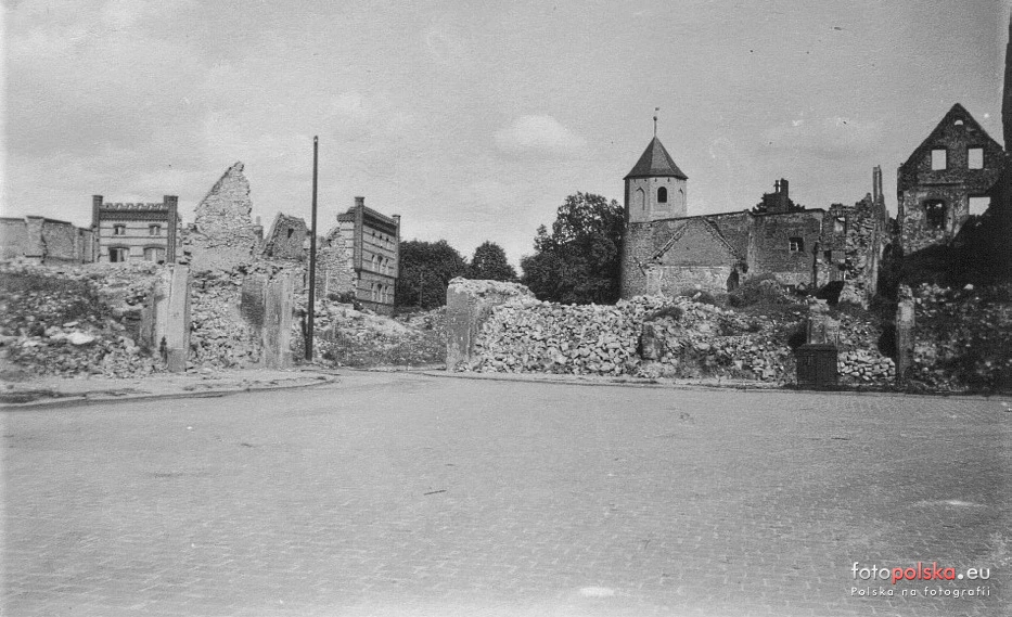 Lata 1945-1955 , Ruiny Szkoły Męskiej przy ul.Michała Archanioła. Obok Rotunda św.Gotarda.Skomentuj zdjęcie