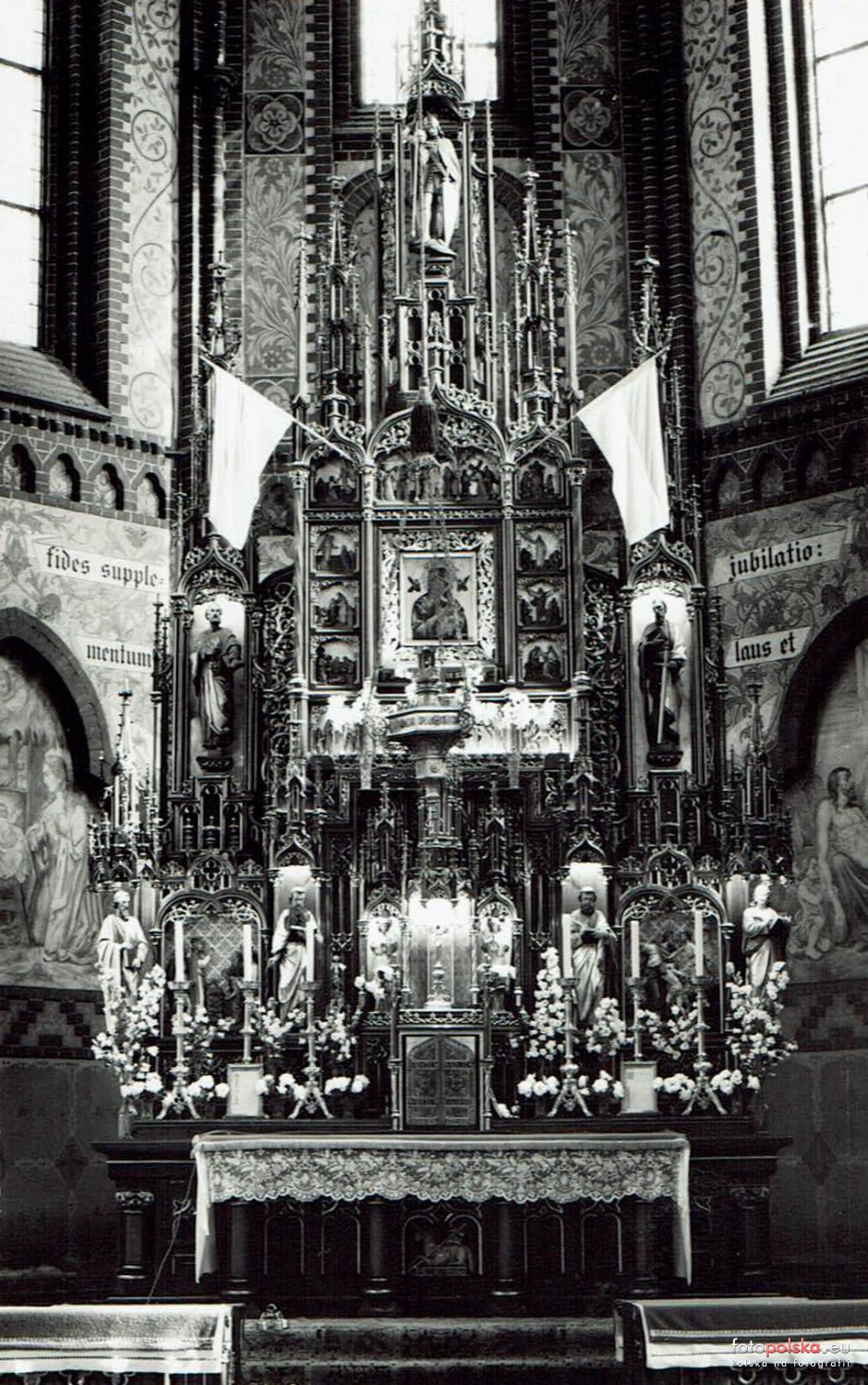 Lata 1960-1965 , Ołtarz główny Kościoła Matki Boskiej Nieustającej Pomocy. Na odwrocie zdjęcie opatrzone jest pieczątką parafii oraz podpisem ówczesnego proboszcza - ks. Pawła Kałuży. Prawdopodobnie fotografia rozpowszechniana wśród parafian przez księży.Skomentuj zdjęcie