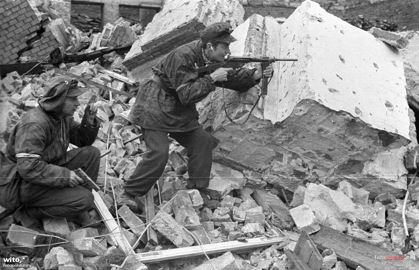 3 września 1944 , Ppor. Henryk Ożarek "Henio" (po lewej) i Tadeusz Przybyszewski "Roma" (po prawej) z kompanii "Anna" Batalionu "Gustaw" w rejonie ulicy Kredytowej-Królewskiej. "Henio" trzyma pistolet "Vis" a "Roma" strzela z Pistoletu maszynowego "Błyskawica".Skomentuj zdjęcie |