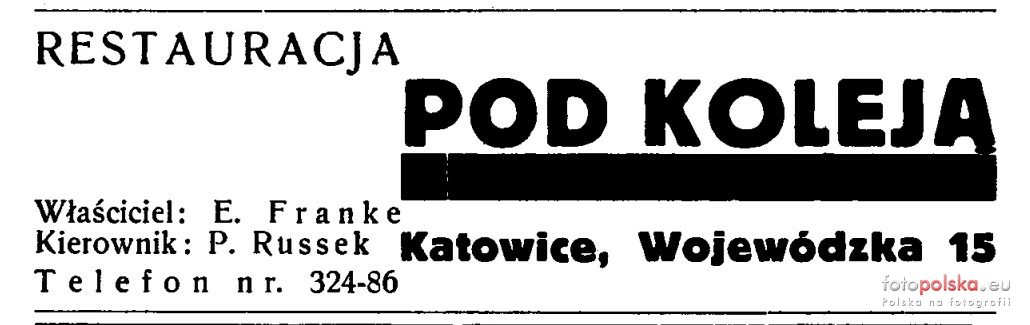 1935 , Reklama restauracji "Pod Koleją", wł. E.Franke. Źródło: Księga adresowa miasta Wielkich Katowic 1935/36 r.Skomentuj zdjęcie |