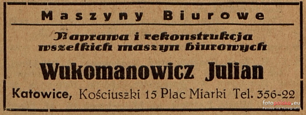 1945 , Reklama - Naprawa i rekonstrukcja maszyn biurowych, Wulkomanowicz Julian. Źródło: Przewodnik informator po Katowicach, 1945.Skomentuj zdjęcie |