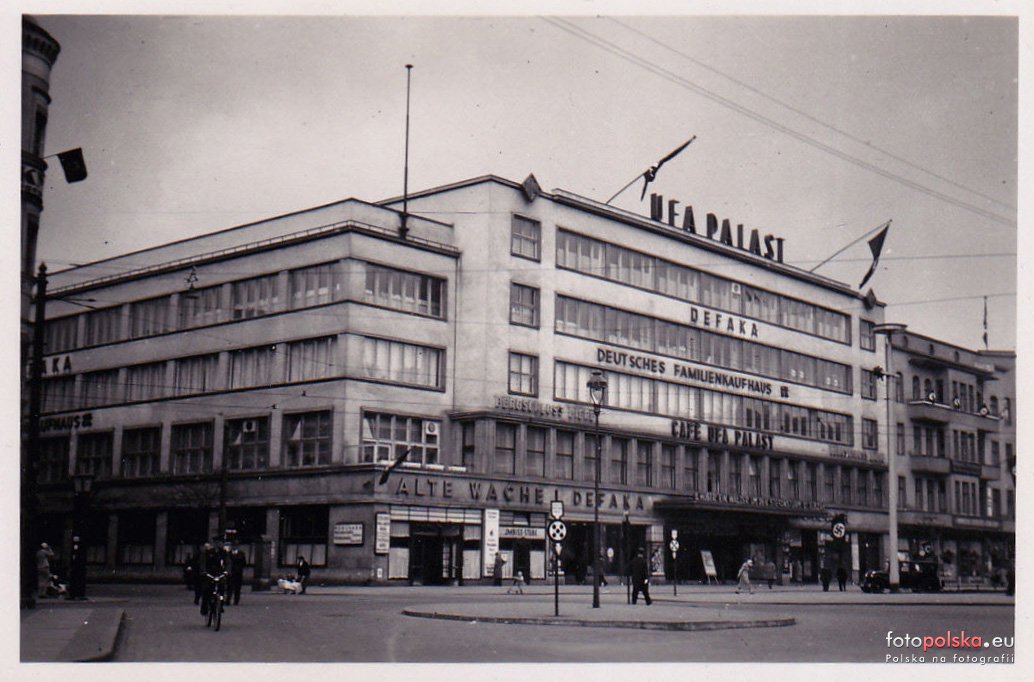 7 pobrań 1417 odsłon 6 średnia ocen Poprzednie i następne zdjęcia esski Obiekty widoczne na zdjęciu Dom towarowy "Posejdon" więcej zdjęć (78) Zbudowano: 1929 Dawniej: Familien Kaufhaus, UFA Palast Dom towarowy w Szczecinie, w którym przed wojną mieścił się szczeciński UFA Palast, po wojnie Dom Towarowy "Posejdon", a następnie Galeria Centrum i EMPiK. Budynek powstał w 1928, a oddany do użytku był w roku następnym. Obiekty te mieściły się przy alei Niepodległości 60 (daw. Paradeplatz 60). Familien Kaufhaus Dom towarowy Familien Kaufhaus należał do nieistniejącej już sieci DeFaKa (Deutsches Familien-Kaufhaus) założonej w 1925. Powstał w miejscu odwachu przy Bramie Portowej należącego do zlikwidowanej Twierdzy Szczecin (w Szczecinie istniał też odwach przy Rynku Siennym). Projektantem nowoczesnego budynku był Max Bischoff. W szczecińskim gmachu DeFaKa mieściły się sklepy, restauracje, kawiarnie, cukiernia, piwiarnia, baru nocny, ogród zimowy i kabaret, m.in. restauracja Alte Wache, kawiarnia Cafe UFA Palast i music-hall. W kinie wyświetlano filmy niemieckie i zagraniczne. Pierwszy film dźwiękowy wyświetlono w 1930, był to film Skandal um Eva. Pierwszym filmem kolorowym wyświetlonym w UFA Palast była popularna komedia Frauen sind doch bessere Diplomaten. Stanowiąca główną atrakcję domu towarowego sala kinowa mieściła się na parterze budynku. Szczeciński UFA Palast, oddany do użytku w 1929, był jednym z kilu wielkich kin UFA Palast zbudowanych przez niemiecką wytwórnię filmową UFA (Universum Film AG). Najstarszym z takich kin był berliński UFA-Palast am Zoo, największym zbudowany w tym samym roku co UFA Palast w Szczecinie UFA-Palast am Gänsemarkt w Hamburgu (2665 miejsc). Kimo szczecińskie mogło pomieścić ponad 1200 widzów na kilku poziomach. Dm handlowy Posejdon i Galeria Centrum W czasie wojny gmach DeFaKa uległ znacznym zniszczeniom w czasie nalotów dywanowych na Szczecin w 1944. W gruzach legło kino wraz z całym skrzydłem od strony Bramy Portowej. Część, która ocalała to skrzydło na skrzyżowaniu ulic Niepodległości i Partyzantów[1][4]. Zniszczeniu uległa modernistyczna fasada, zachował się natomiast szkielet żelbetowy. Po wojnie zachowaną część budynku odbudowano w 1951 jako dom towarowy, wygląd znacznie odbiegał jednak od przedwojennego. Dom Towarowy "Posejdon" został oddany do użytku 31 grudnia 1951 r. a jako całość w roku następnym, był jednym z tzw. PEDET-ów (tj. należał do sieci (Państwowe Domy Towarowe). Nazwę "Posejdon" wybrali dla domu towarowego w 1968 czytelnicy "Kuriera Szczecińskiego". Charakterystyczny dla budynku był neon z napisem "PDT sprzedaje korzystnie". W wrześniu 1993 przekształcony został w DT "Centrum". Następnie przejęła go sieć Galeria Centrum, w budynku mieścił się także EMPiK. Obiekt całkowicie zamknięto w 2009 roku. Źróło: Autorzy: Licencja: [ CC-BY-SA 3.0] al. Niepodległości więcej zdjęć (849) Dawniej: Paradeplatz |