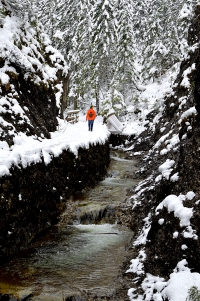 Dolina Białego więcej zdjęć (18) Dolina Białego – dolina reglowa w Tatrach Zachodnich, położona pomiędzy grzbietami Krokwi i Sarniej Skały. Topografia Dolina ma długość 2,5 km i powierzchnię 300 ha. Ograniczona jest: • od zachodu grzbietem wyrastającym spod ściany Długiego Giewontu, w którym znajdują się Wyżnia Sucha Przełęcz, Sucha Czubka, Niżnia Sucha Przełęcz, Suchy Wierch, Czerwona Przełęcz i Sarnia Skała; następnie północno-wschodnim grzbietem Sarniej Skały z wzniesieniami Zawieszki, Łomika i Kopy nad Białym, • od południa i południowego wschodu częścią grani Długiego Giewontu, od Juhaskiej Kopy przez Wyżnie Wrótka i Turnię nad Białem po Wrótka, a następnie Kalacką Kopą, Białym Grzbietem, Wyżnią i Niżnią Przełęczą Białego, • od wschodu Małą Krokwią, Siwarowym Siodłem, Krokwią i jej północno-zachodnim ramieniem. Wylot Doliny Białego znajduje się na wysokości około 910 m n.p.m. przy Drodze pod Reglami, blisko 0,5 km na zachód od Wielkiej Krokwi, na południowym skraju Lasu Białego. Ma postać wąwozu, w którym od wschodniej strony wznoszą się skały Korycisk, od zachodniej Kazalnica. W swej górnej części Dolina Białego rozdzielona jest krótką grańką z Zameczkami i Igłą na dwa podobnej wielkości odgałęzienia – Dolinę Suchą na zachodzie i bezimienną dolinkę na wschodzie, która wyżej przekształca się w Żleb pod Wrótka. Do Doliny Suchej uchodzi Potargany Żleb i Skośny Żleb, do wschodniej gałęzi Żleb pod Patyki (z Niżniej Przełęczy Białego), a do głównej części Siwarowy Żleb (z Siwarowego Siodła) – wszystkie z orograficznie prawej strony[4]. Geologia i hydrologia Dolina wypreparowana jest w skałach osadowych: wapieniach, dolomitach, podrzędnie łupkach. Jest przeważnie wąska i głęboko wcięta, o charakterze wąwozu krasowego – zwłaszcza jej dolny odcinek u stóp Kazalnicy, zwany Kotłami. W dolinie występują liczne skałki, w potoku progi i niewielkie wodospady oraz baniory. Przepływa przez nią Biały Potok o dużym spadku wynoszącym ok. 187 m/km. Przyroda Roślinność występująca w dolinie ma charakter typowej roślinności regla dolnego (tj. świerk, buk, jodła). Blisko wylotu znajduje się na skałach jedno z najniżej położonych stanowisk kosodrzewiny (920 m), a w strefie górnej granicy lasu – skupiska limb. Z powodu zacieniającego działania potężnego masywu Giewontu klimat Doliny Białego jest znacznie bardziej surowy, niż wynikałoby to z jej wysokości nad poziomem morza, a piętra roślinności są tutaj obniżone. Ciekawa flora. M.in. stwierdzono tutaj występowanie storzana bezlistnego (ostatnio nie potwierdzono jego występowania, na opisanym stanowisku wyginął), ostrożenia głowacza, sosny drzewokosej, gnidosza Hacqueta i irgi kutnerowatej – roślin rzadkich w Polsce, występujących tylko na nielicznych stanowiskach. Walory przyrodnicze Doliny Białego chronione są od 1954 r., kiedy utworzono tu rezerwat ścisły, nazwany później (1965) imieniem Stanisława Sokołowskiego. Jednym z głównych powodów jego powołania była potrzeba ochrony głuszców i cietrzewi. Historia Górna część Doliny Białego należała niegdyś do Hali Białe. Na jej terenie znajdowała się (w Dolinie Suchej, u stóp Czerwonej Przełęczy) Polana Białego. Droga na pastwiska prowadziła wysoko stokami Kopy nad Białym, omijając Kotły, gdyż ich przejście, zwłaszcza przy wysokim stanie wody, stanowiło wtedy poważny problem. Obecnie istniejącą drogę nad potokiem zbudowano ok. 1905 roku[2]. W połowie XIX wieku upłaz Białe znajdujący się w Dolinie Suchej wiosną służył jako pośredni etap dla owiec pędzonych na Halę Kondratową przez urwiste perci Giewontu. Na upłazie tym podobno znany przewodnik tatrzański Bartłomiej Obrochta grywał na skrzypcach również znanemu zbójnikowi Wojtkowi Matei. Na początku lat 50. XX wieku prowadzono w dolinie poszukiwania rud uranu, wykuwając w jej prawym zboczu dwie sztolnie w Dolinie Białego. W triasowych łupkach znajdowały się wulkaniczne tufity często zawierające rudy uranu. W czasie prowadzenia tych prac dolina była zamknięta dla turystów i pilnie strzeżona. Otwór dolnej sztolni (o długości 270 m) znajduje się przy żółto znakowanym szlaku turystycznym i jest zagrodzony drewnianą kratą. Górna jest położona na wysokości 1030 m n.p.m., a łączna długość jej korytarzy sięga 400 m. Źródło: Tatry Zachodnie więcej zdjęć (46) Tatry Zachodnie (514.52; słow. Západné Tatry) – jedno z trzech pasm górskich Łańcucha Tatrzańskiego, będące zachodnią częścią Tatr. Położone w Polsce i na Słowacji. Nazwa rozpowszechniła się w polskiej literaturze dopiero po 1868 roku, dawniej używano także nazw: Hale Liptowskie, Hale Liptowsko-Orawskie, Hale Liptowsko-Nowotarskie. Tatry więcej zdjęć (121) Biały Potok więcej zdjęć (9) Biały Potok – potok, prawostronny dopływ Młynisk o długości 4,49 km, powierzchni zlewni 3,256 km² i średnim spadku 12%. Potok płynie Doliną Białego w Tatrach Zachodnich. Ma dwa źródłowe cieki, spływające dwoma górnymi odnogami Doliny Białego. Lewy ciek wypływa ze źródła na wysokości 1400 m pod Suchym Wierchem i spływa Doliną Suchą – zachodnią odnogą Doliny Białego. Na odcinku do Polany Białego jest to ciek okresowy; woda stale płynie tylko w skalnych partiach koryta, zanika natomiast w miejscach wypełnionych rumowiskiem. W okolicach Polany Białego, gdzie występują łupki, jest to już potok stały, zasilany kilkoma źródłami i niewielkimi ciekami. Poniżej polany potok zmienia bieg z północnego na wschodni i przełamuje się przez dolomitowe skały pomiędzy turniami Zawieszka i Igła. Dolina ma tutaj charakter kanionu, a w korycie potoku występują progi o wysokości 2–3 m i skalne rynny. Woda rozdziela się na kilka strug. Drugi ciek wypływa ze źródła znajdującego się na wys
