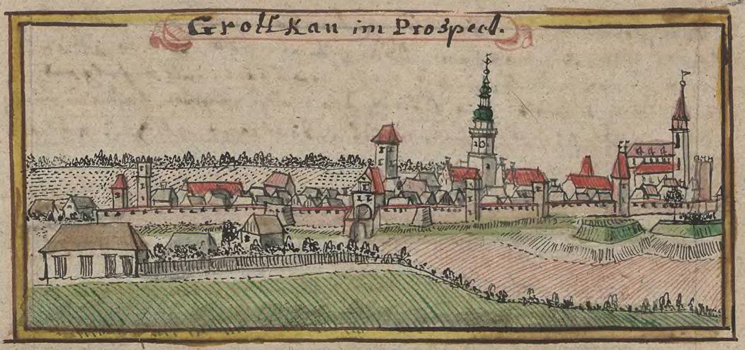 Lata 1750-1800 , Panorama Grodkowa według rysynku Friedricha Bernharda Wernhera z jego dzieła "Silesia in Compendio seu Topographia das ist Praesentatio und Beschreibung des Herzogthums Schlesiens [...] Pars I".Skomentuj zdjęcie