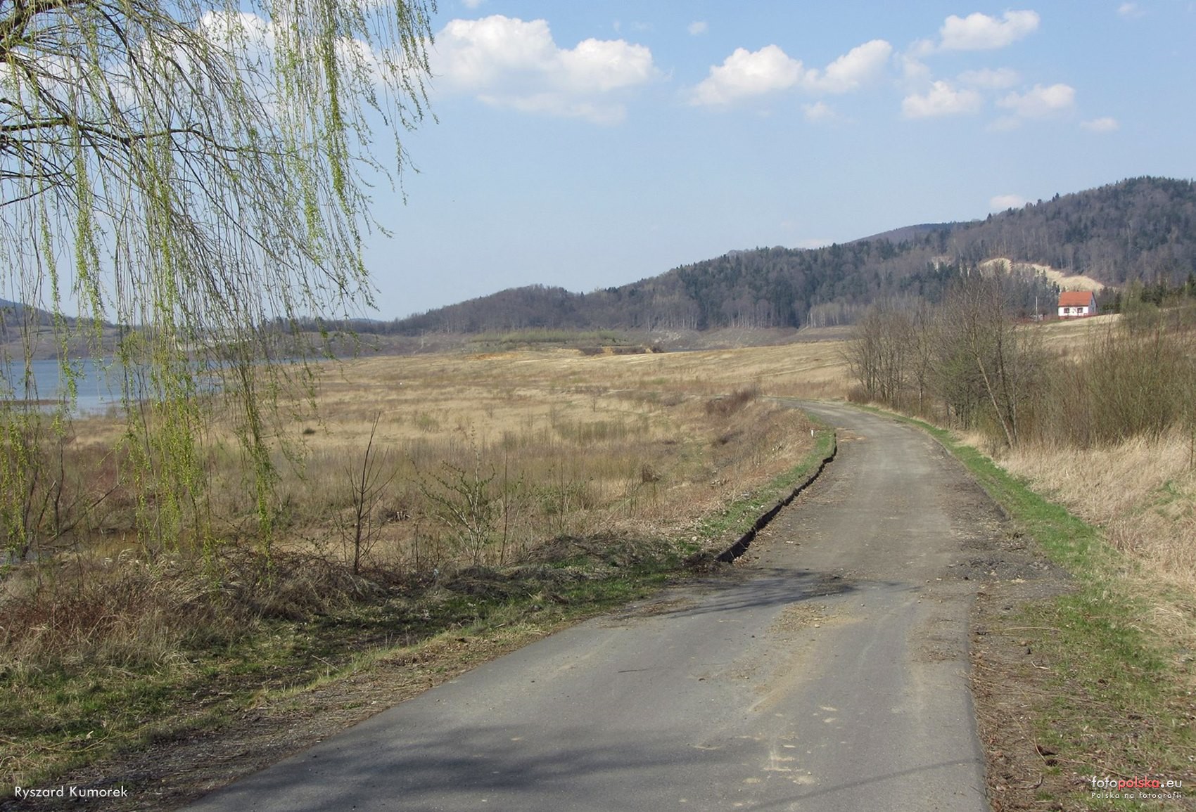 2 kwietnia 2017 , Fragment terenu zalewowego sztucznego zbiornika wodnego Świnna Poręba. Na pierwszym planie dawna droga z Suchej Beskidzkiej do Wadowic (DK 28, poprzednio DK 98) ze zdartą wierzchnią warstwą asfaltu. Mniej więcej do tego miejsca będzie sięgać woda. W głębi w środku kadru widać dwie kępy zieleni. To dwie sztucznie utworzone wyspy. Po prawej dom w Mucharzu, który będzie się znajdował najbliżej przyszłej linii brzegowej zalewu. Po lewej stronie widać "zbliżającą" się wodę.Skomentuj zdjęcie |