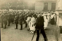 18 sierpnia 1916 , Obecnie Szkoła Podstawowa nr 8 Specjalna w Ośrodku Szkolno - Wychowawczym. Opis - Dienstfreie Offiziere bei der Feldmesse, Hauptquartier.