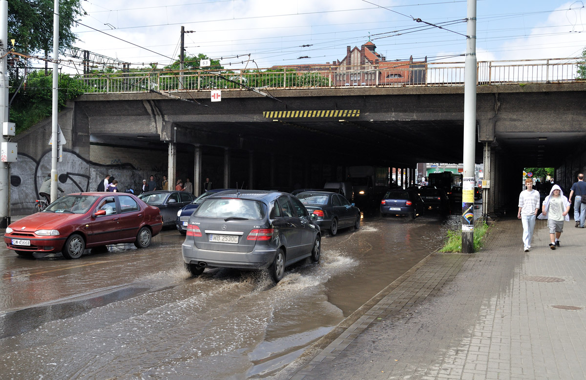22 maja 2010 , Woda zalewa też przejazd pod wiaduktem na ulicy Trzebnickiej. Zawieszono kursowanie tramwajów na ulicy Trzebnickiej.Skomentuj zdjęcie