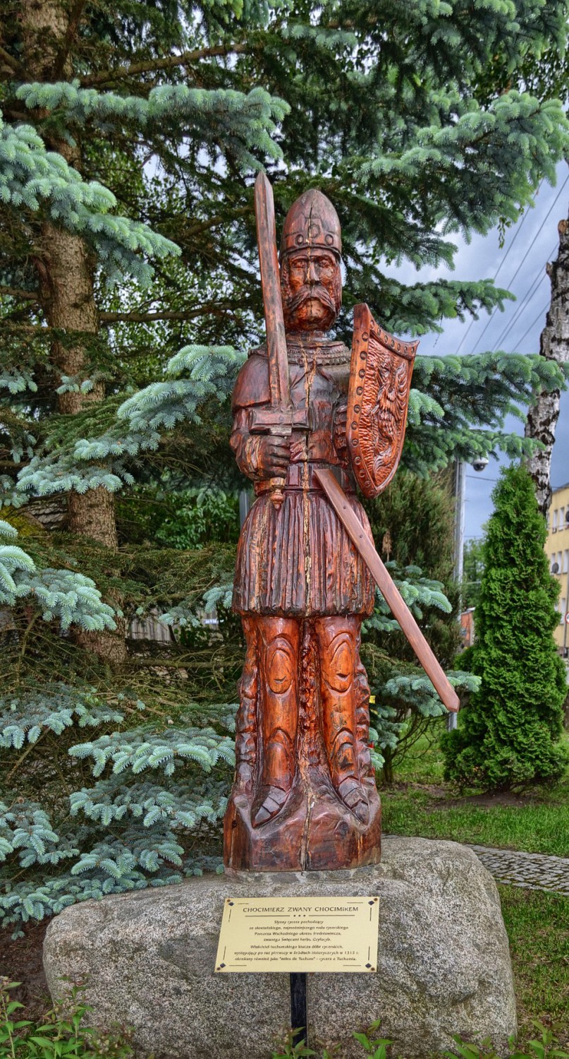 Tekst na tabliczce: "Chocimierz zwany Chocimirem. Słynny rycerz pochodzący ze słowiańskiego rodu rycerskiego Pomorza Wschodniego okresu średniowiecza, zwanegom Święcami herbu Gryforyb. Właściciel tuchomskiego klucza dóbr rycerskich, występujący po raz pierwszy w źródłach historycznych w 1315 r. określany również jako "miles de Tuchom" - rycerz z Tuchomia."