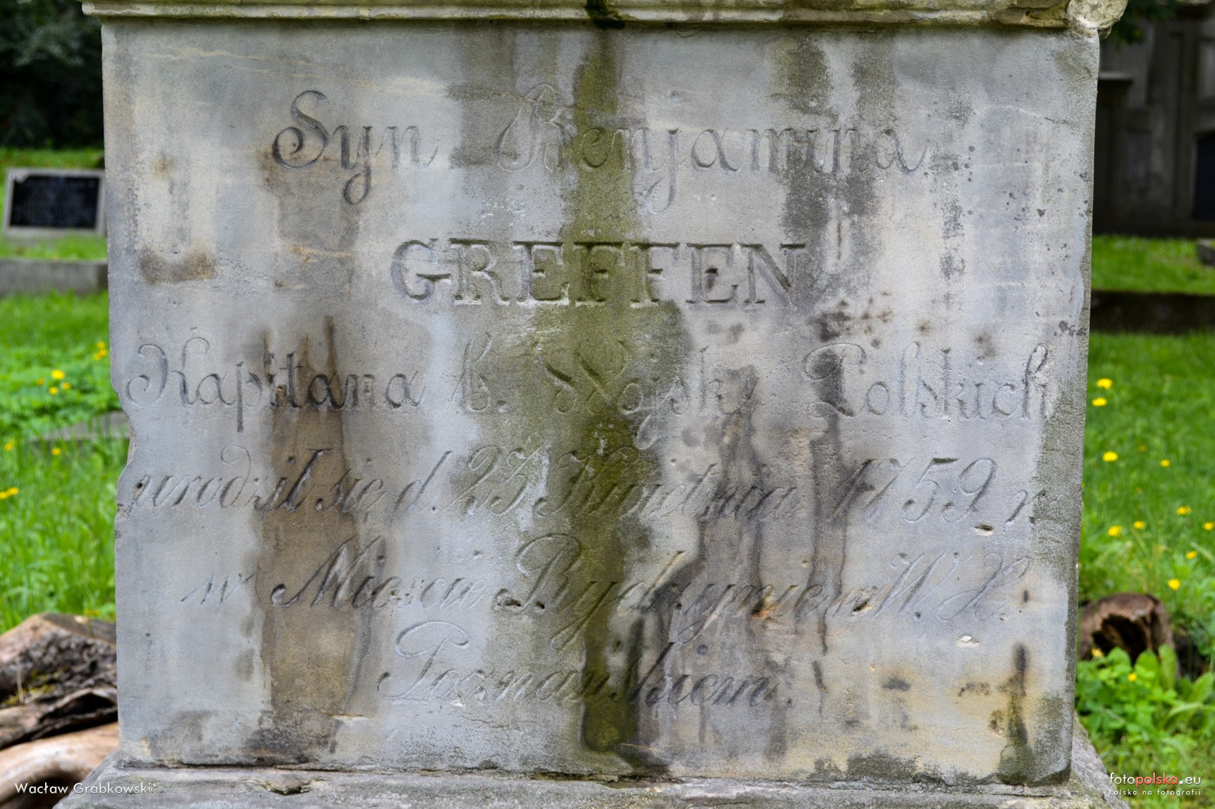 26 lipca 2017 , Treść: "Syn Benjamina/GREFFEN/Kapitana b. Wojsk Polskich/urodził się d. 23 Kwietnia 1759 r./w mieście Bydzynie w W. K./Poznańskiem".Skomentuj zdjęcie |