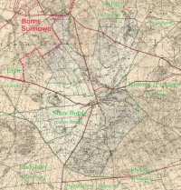 Kolorem zielonym zaznaczono ówczesne granice wsi, kolorem czerwonym granicę miasta Borne Sulinowo. Dla lepszej orientacji dodano aktualny przebieg dróg o nawierzchni utwardzonej.