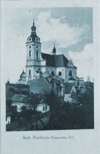 Lata 1910-1920 , Kościół parafialny w Krzanowicach. Na zdjęciu widoczna również kamienica przy ulicy Kościelnej 4.Skomentuj zdjęcie