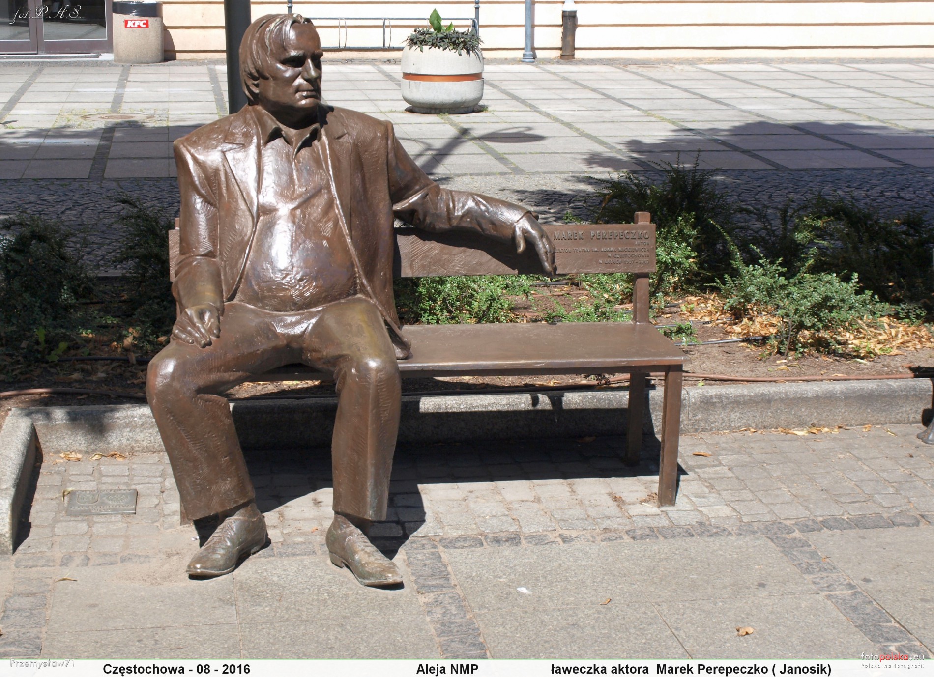 Ławeczka Marka Perepeczki więcej zdjęć (5) Ławeczka Marka Perepeczki w Częstochowie – pomnik aktora Marka Perepeczki, odsłonięty 31 października 2014 w Częstochowie. Pomnik znajduje się przy alei Najświętszej Maryi Panny, w pobliżu Muzeum Pielgrzymowania, naprzeciw ławeczki Haliny Poświatowskiej. Jej autorem jest rzeźbiarz Wojciech Pondel. Wykonana z brązu rzeźba pomnikowa, przedstawia postać aktora, siedzącego na ławce parkowej. Obok niego umieszczono tablicę informacyjną. Odsłonięcia ławeczki dokonali żona Marka Perepeczki, Agnieszka Fitkau-Perepeczko, Andrzej Kalinin i prezydent miasta Krzysztof Matyjaszczyk. wikipedia (fantom) al. Najświętszej Maryi Panny więcej zdjęć (1980) Dawniej: Najświętszej Marii Panny Plac Biegańskiego w Częstochowie – jeden z placów w Śródmieściu Częstochowy, leżący na drodze pątniczej na Jasną Górę, dzielący Aleję Najświętszej Maryi Panny na tzw. „drugą aleję” - na wschód od placu, i „trzecią aleję” - na zachód od niego. Historia W południowej części placu w latach 1828–1836 według projektu Franciszka Reinsteina wzniesiono ratusz wraz z odwachem i nieistniejącym już aresztem. Wybudowano go w połowie drogi między Starą a Nową Częstochową. W 1908 przebudowany. Późnoklasycystyczny, piętrowy z okrągłą dwukondygnacyjną wieżą. Był siedzibą władz miasta do lat 60. XX w., obecnie – wraz z odwachem – należy do Muzeum Częstochowskiego. W latach 1892–1926 na tyłach ratusza mieściła się elektrownia. Przed ratuszem po II wojnie światowej ustawiono pomnik sowieckiego czołgisty. 9 maja 1968 zastąpiono go wysokim pomnikiem wdzięczności Armii Radzieckiej autorstwa Mariana Koniecznego. Od 11 listopada 1997 w tym miejscu stoi pomnik marszałka Józefa Piłsudskiego. Kilka razy w roku odbywają się na placu imprezy, takie jak finał Wielkiej Orkiestry Świątecznej Pomocy, uroczystości patriotyczne, obchody Dni Częstochowy czy zabawa sylwestrowa. W północnej części placu, w środku zadrzewionego skweru, znajduje się rzymskokatolicki kościół św. Jakuba Apostoła. Pierwotnie od XVI w. stał tu kościół pod tym samym wyzwaniem obok przytułku dla chorych pielgrzymów. Po powstaniu styczniowym został rozebrany przez władze rosyjskie, a na jego miejscu w latach 1870–1872 wzniesiono prawosławną cerkiew świętych Cyryla i Metodego. W 1918 zamieniona na kościół rzymskokatolicki z przywróconym pierwotnym wezwaniem św. Jakuba. Eklektyczny. Mimo usunięcia cebulastych hełmów w 1948, nadal w stylu rusko-bizantyjskim. Pierwotną nazwą placu był Rynek św. Jakuba. W latach 30. XX w. nazwano go placem Bronisława Pierackiego. W okresie okupacji hitlerowskiej nosił nazwę Westring, a w czasach stalinizmu – placu Józefa Stalina. Obecna nazwa – plac Władysława Biegańskiego – obowiązuje od 1956 roku. Źródło: |