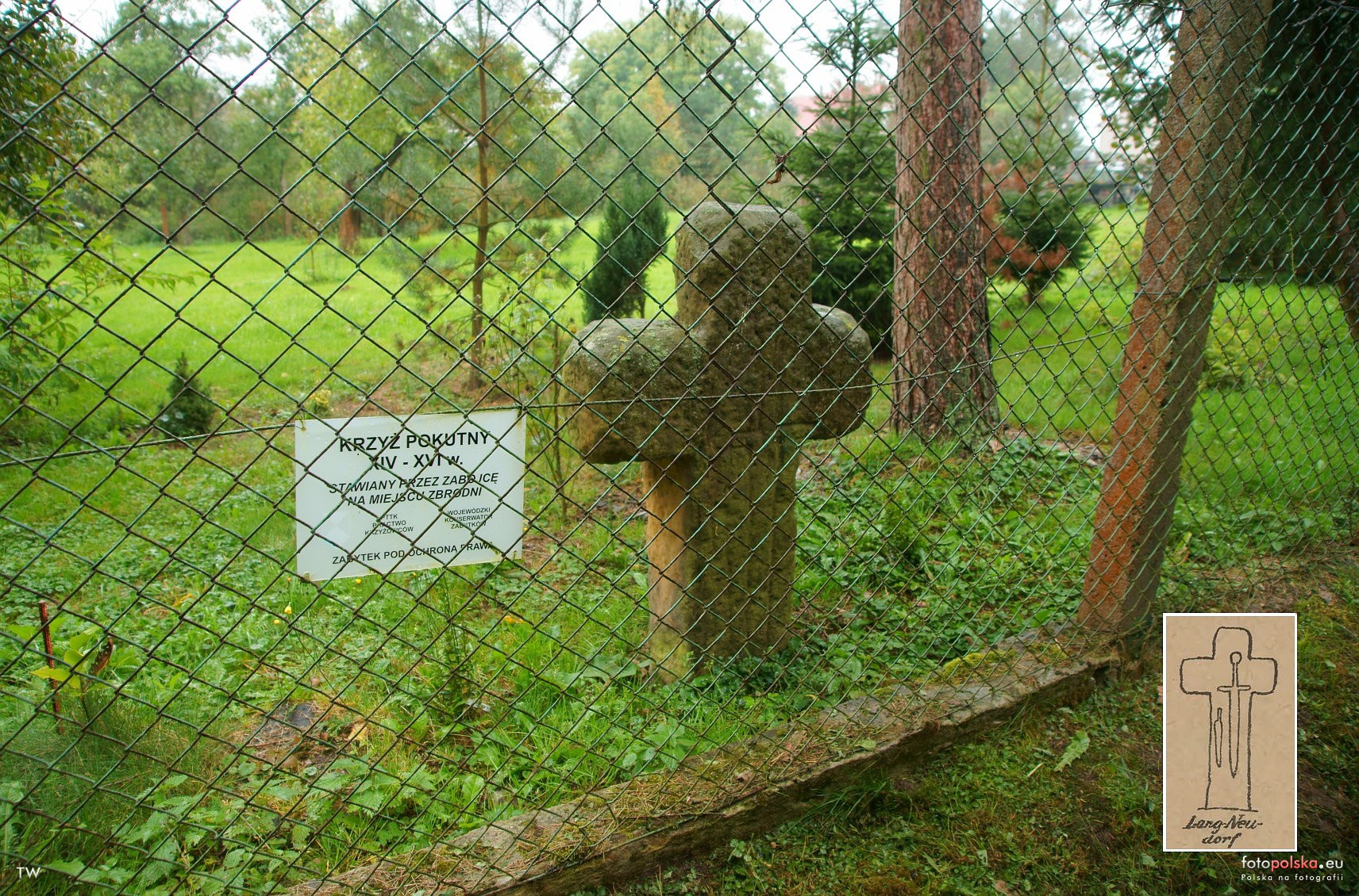 23 września 2017 , Kamienny krzyż w Dłużcu, stojący przy drodze do Twardocic, za siatką posesji nr 62;wym, ok. 110 x 70 x 25 cm, piaskowiec; krzyż posiada podwójny ryt: miecza i noża [na miniaturce rysunek M. Hellmicha - "Steinerne Zeugen mittelalterlichen Rechtes in Schlesien Steinkreuze, Bildstocke, Staupsaulen, Galgen, Gerichtstische" - z 1923 r. Zielonogórska Biblioteka Cyfrowa].Skomentuj zdjęcie