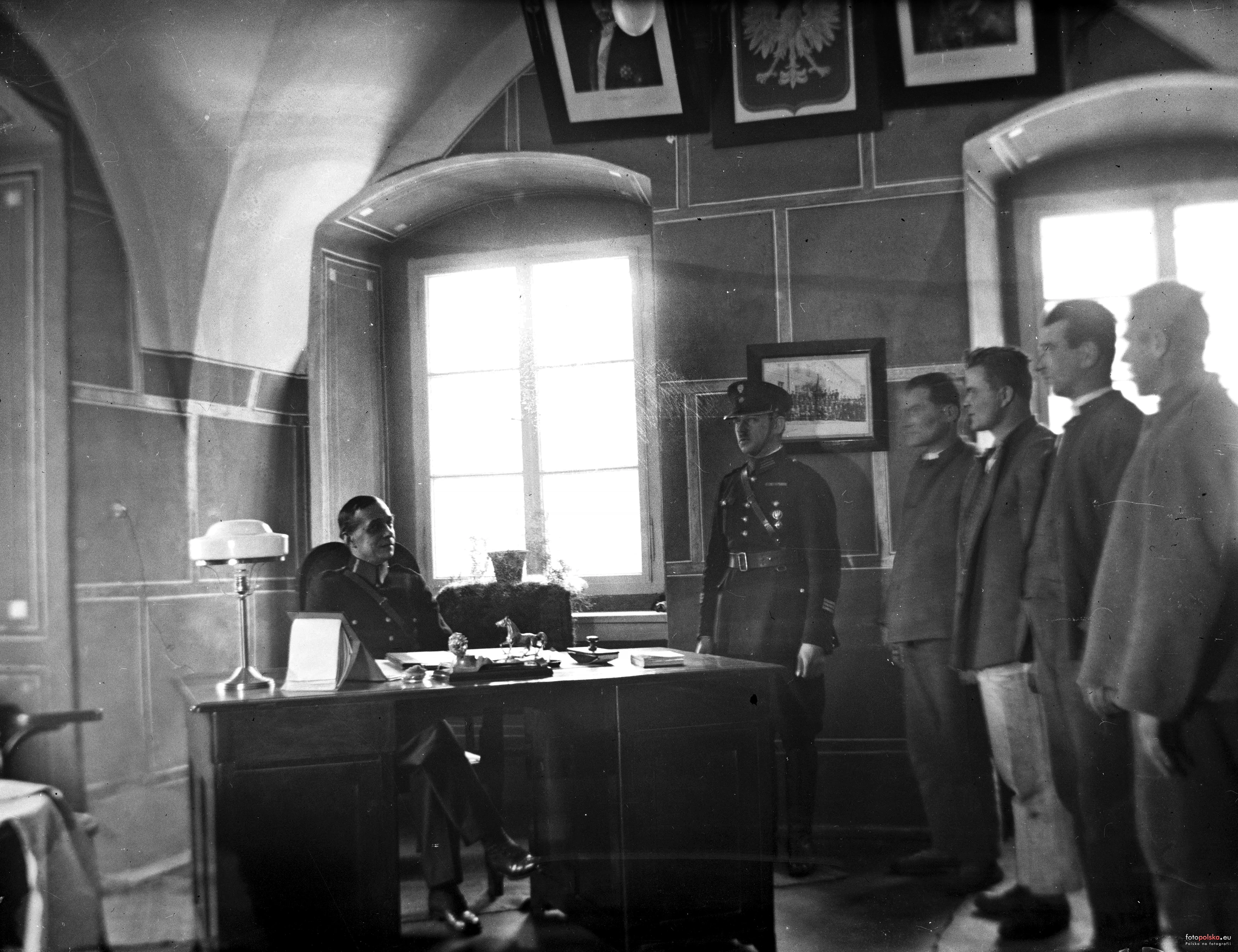 1932 , Więzienie Karno-Śledcze w Nowym Sączu. Naczelnik więzienia Wacław Gerlach przyjmuje raport od więźniów.Skomentuj zdjęcie