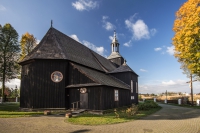 0 pobrań 937 odsłon 6 średnia ocen Poprzednie i następne zdjęcia s_mile Obiekty widoczne na zdjęciu Kościół Narodzenia Najświętszej Maryi Panny więcej zdjęć (7) Atrakcja turystyczna Zbudowano: 1532,1760 Zabytek: kl.IV-73/75/54 z 03.06.1954; 512 z 18.02.1991 Kościół p.w. Narodzenia NMP (pierwotnie p.w. Świętego Mikołaja) z 1532 r. W 2 poł. XVI w. w rękach innowierców. Rozbudowany o kaplicę ok. 1610 r. Dobudowa wieży w 1 poł. XVIII w. Restaurowany i przebudowany 1760 r. z przebudową kaplicy p.w. Świętej Tekli, staraniem Maksymiliana Molskiego kasztelana rogozińskiego. Polichromia z 1761 r. nie zachowana. Remontowany w latach 1875 – 85 i 1969 – 73 – wymiana gontów, podłogi i wzmocnienie konstrukcji i 1988 – 90. Kościół drewniany, jednonawowy konstrukcji zrębowej. Orientowany, zbudowany z drzewa modrzewiowego. Zaliczany do grupy późnogotyckich kościołów, odmiany śląskiej. Mniejsze prezbiterium od nawy, zamknięte trójbocznie z przylegającą zakrystią. Z boku nawy kaplica, kryta gontowym dachem namiotowym. Wieża od frontu, konstrukcji słupowej z kruchtą w przyziemiu. Zwieńczona dachem namiotowym z blaszanym hełmem cebulastym z latarnią i chorągiewką z datą „1885”. Dach jednokalenicowy, kryty gontem. Wewnątrz strop płaski wspólny dla nawy i prezbiterium. Chór muzyczny wsparty na dwóch słupach z prospektem organowym i parapetem o prostej linii. Podłoga z desek. Ołtarze rokokowe: główny z 1780 r., dwa boczne i z kaplicy z 1760 r. Ambona wczesnobarokowa z 1 poł. XVII w. z namalowanymi wizerunkami czterech ewangelistów. Cenne obrazy i tryptyk z XVII w. Drewniana dzwonnica, konstrukcji słupowo – ramowej z 2 poł. XVIII w. Zbudowana na planie kwadratu, kryta namiotowym dachem gontowym. |