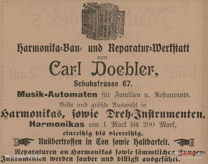harmonijki ustne, a także instrumenty obrotowe. Harmonijki od 1 marki do 200 marek, rzędy od 1 do 4 rzędów.