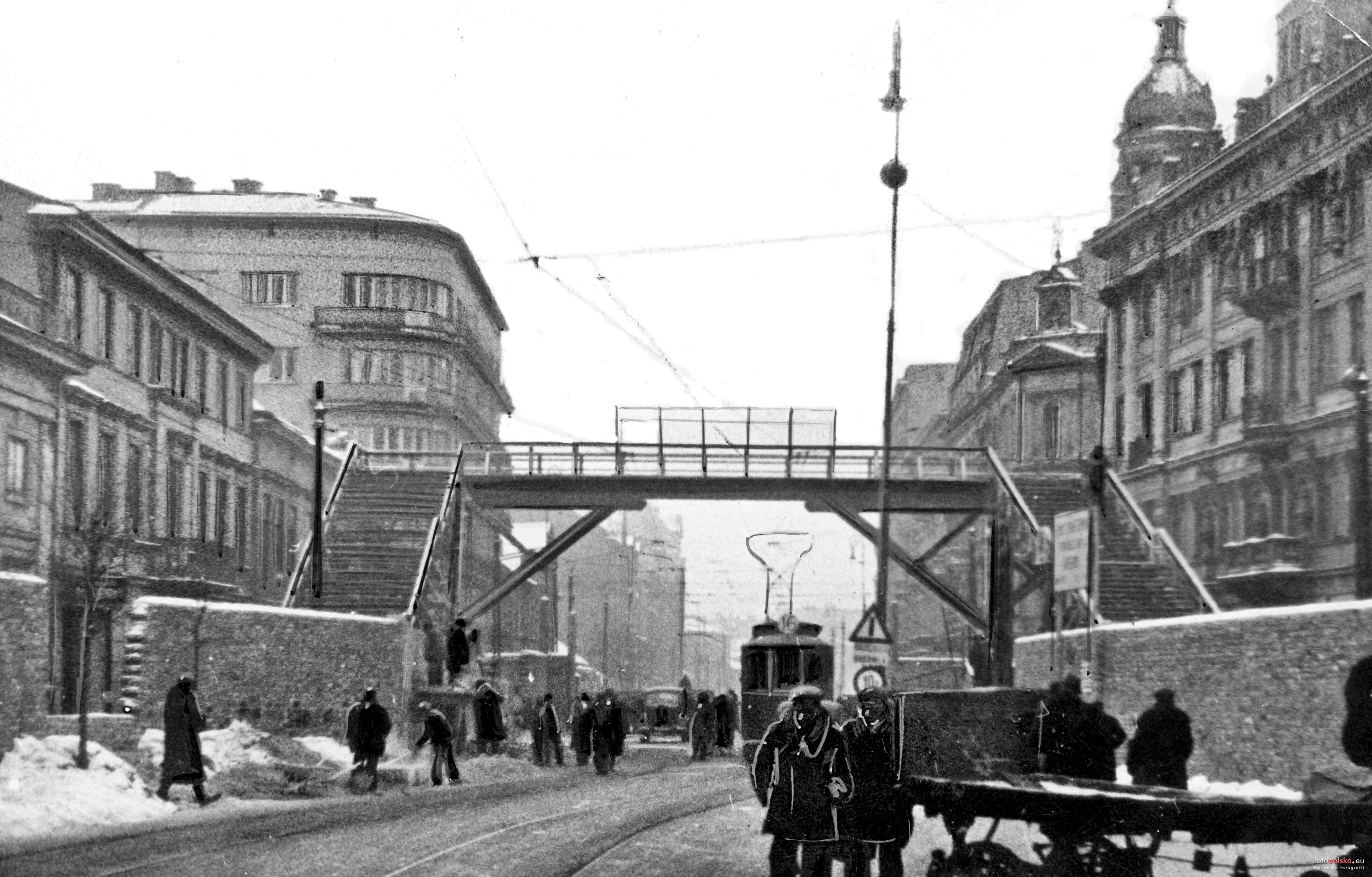 luty 1942 , Kładka nad ul. Chłodną łącząca dwie części getta. Widoczny tramwaj linii 16.Skomentuj zdjęcie