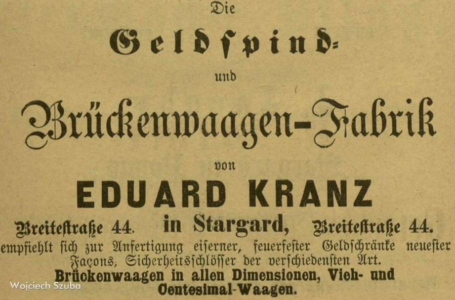 Breitestraße 44. w Stargardzie, poleca się szanownej klijenteli do produkcji żeliwnych, ognioodpornych sejfów najnowszych fasonów, zamków antywłamaniowych wszelkiego rodzaju, wag pomostowych we wszystkich wymiarach, wag bydlęcych i setnych.