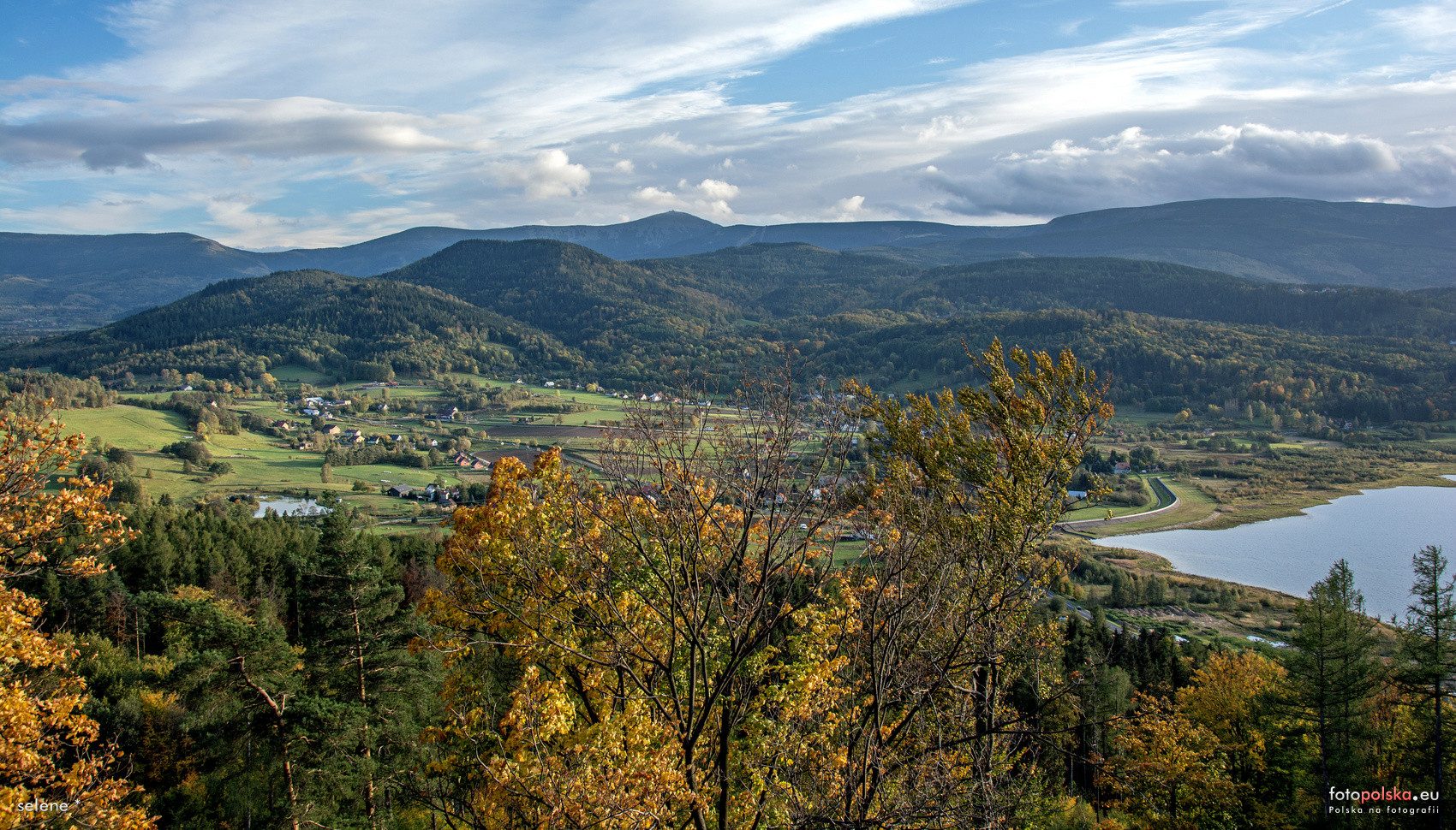 9 października 2017 , Widok na Karkonosze, Sosnówkę i zbiornik wodny Sosnówka z wieży zamku księcia Henryka za górze Grodna.Skomentuj zdjęcie