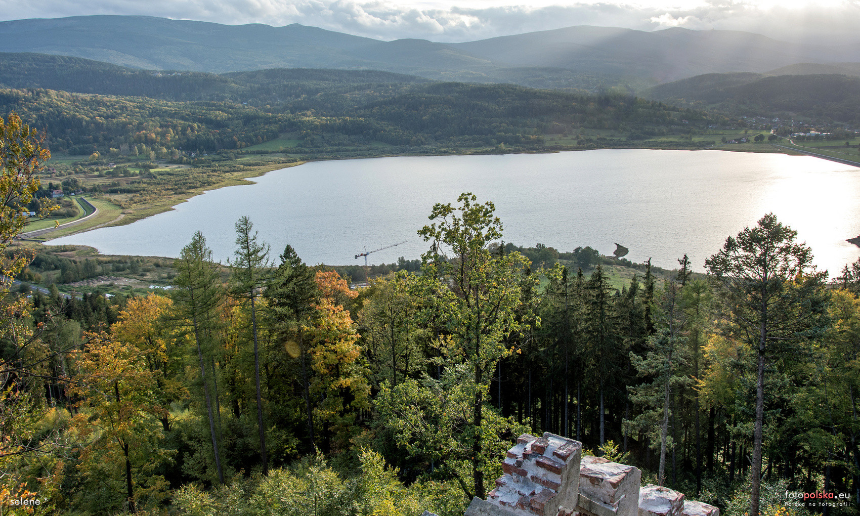 9 października 2017 , Widok na Karkonosze, Sosnówkę i zbiornik wodny Sosnówka z wieży zamku księcia Henryka za górze Grodna.Skomentuj zdjęcie