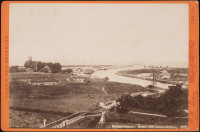 1879 , Widok z blizy (starej latarni morskiej) w kierunku wejścia do portu gdańskiego. Z lewej widoczna stacja pilotów z ustawioną w 1876 r. drewnianą wieżą kuli czasu. Na pierwszym planie żelazna kładka dla pieszych przerzucona nad torami kolejowymi w pobliżu dworca Neufahrwasser, dalej widoczny jeden z szańców (Blies-Schanze Nr. 5) zbudowanych przez wojsko pruskie dla obrony wejścia do gdańskiego portu. |