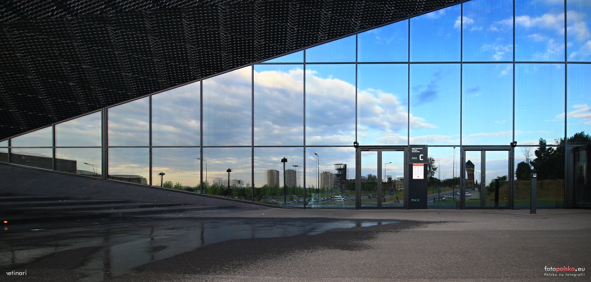26 czerwca 2017 , Tylna śklana sciana Międzynarodowego Centra Kongresowego s odbiciem placu kolo szybu Warszawa i Nowego Muzea Śląskiego.Skomentuj zdjęcie