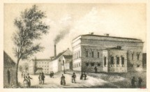 Lata 1850-1853 , Dom Ludwika Geyera przy Górnym Rynku (zwanym również później Rynkiem Geyera). W tle widać także zabudowania fabryczne należące do Geyera oraz jego najstarszy dom, z facjatą. Za domem nieistniejąca już farbiarnia. Litografia W. Walkiewicza z "Opis miasta Łodzi" Oskara Flatta 1853 r. Położenie obiektu zaznaczone na mapieSkomentuj zdjęcie |