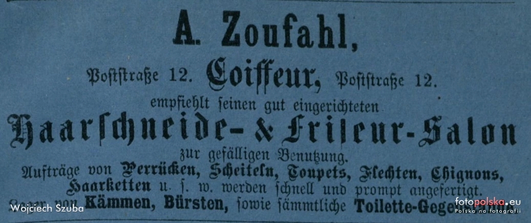 1876 , A. Zoufahl, Poststrasse 12. Fryzjer