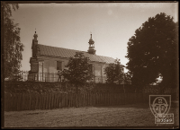 1911 , Trzeci, murowany kościół powstał w latach 1778 - 1780 z inicjatywy opata sieciechowskiego Leonarda Prokopowicza. W początkach XX w. ks. Czesław Wasiński postanowił zbudować większy kościół. Powstał on w latach 1911 - 1914 wysiłkiem całej parafii. Do prezbiterium ze starego kościoła dobudowano nawę. Nieszczęśliwie, w początku I wojny światowej 17 października 1914 kościół został zniszczony przez Rosjan ostrzałem artyleryjskim z twierdzy Dęblin. Rosjanie bowiem uznali kościół za punkt schronienia Niemców. W roku następnym Austriacy wysadzili wieże i resztki kościoła legły w gruzach. Wtedy ks. Wasiński wybudował tymczasową kaplicę z cegły ze zburzonego kościoła wraz ze złączoną z nim plebanią. Kościół obecny według „notatek" projektu arch. Jarosława Wojciechowskiego został zbudowany w latach 1925 - 1934Skomentuj zdjęcie |
