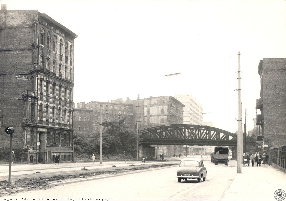 1965 , Wrocław, dzielnica Grabiszyn wiadukt kolejowy przy ulicy Grabiszyńskiej. Wrocławiaków proszę o rozszyfrowanie numerów widocznych kamienic. Zdjęcie ze zbiorów Adama Pacześniaka.Skomentuj zdjęcie