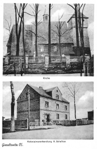 Lata 1930-1935 , Na górnym zdjęciu kościół św.Katarzyny z XVI wieku przeniesiony w latach 1975 – 1976 do Rybnika-Wielopola; na dolnym budynek ze sklepem spożywczym R. Schafrona. Kościół znajdował się w pobliżu dzisiejszego kościoła parafialnego.Skomentuj zdjęcie