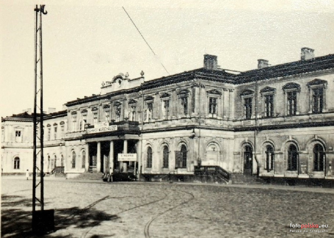 1940 , Dworzec terespolski (już jako Warszawa Wschodnia - Ost) w czasie okupacji. Widok od frontu. Na pierwszym planie widać fragment torów przydworcowej pętli tramwajowej.Skomentuj zdjęcie |