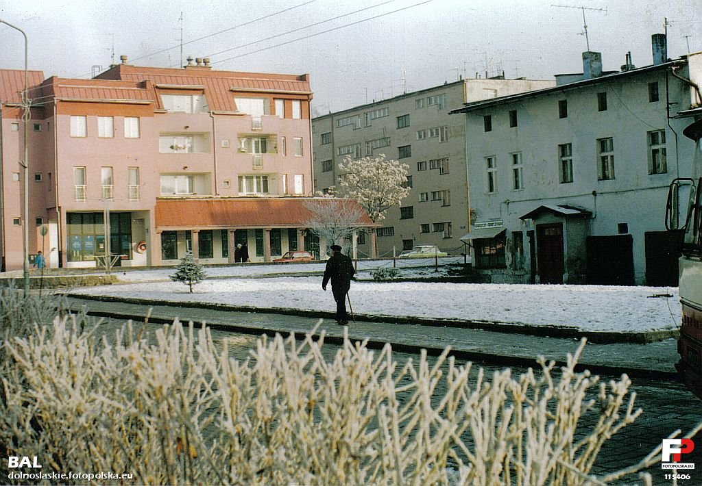 Lata 1980-1990 , Zdjęcie pokazujące trzy budynki trzech różnych ulic. Od lewej strony budynek ul Kościuszki widoczny na ./32610,foto.html (również od lewej) , pośrodku przy ul Podwale nr 6-10 i z prawej ul Rybna nr 2. |