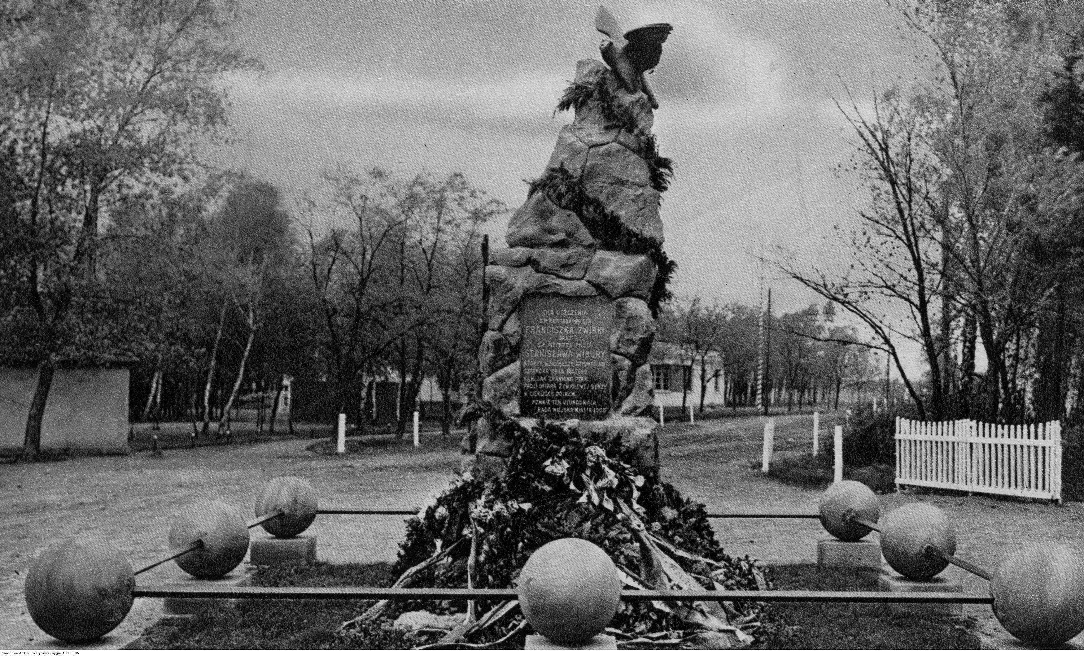 1933 , Lublinek. Pomnik ku czci kpt. pil. Franciszka Żwirki i inż. pil. Stanisława Wigury. Odsłonięty w 1933 r., zniszczony przez Niemców w 1939 r.Skomentuj zdjęcie