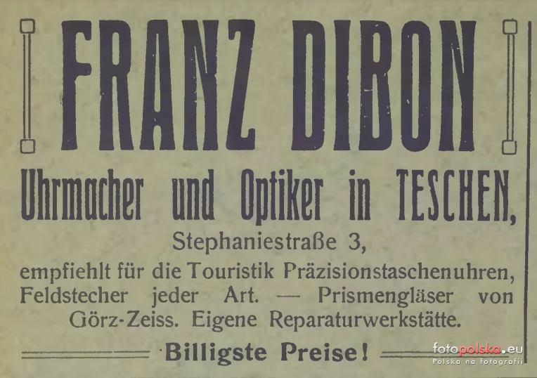 1909 , Reklama zakładu optycznego Franz Dibon. Źródło: Mitteilungen des Beskidenvereins, 1909, 1,3, 5-6Skomentuj zdjęcie |