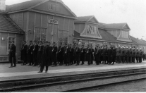 19 marca 1933 , Obchody imienin marszałka Józefa Piłsudskiego obchodzone przez kolejarzy w granicznym Turmoncie (granica polsko-łotewska). Oddziały męskie i żeńskie Kolejowego Przysposobienia Wojskowego oraz Kolejowej Straży Ogniowej defilują na peronie.Skomentuj zdjęcie |