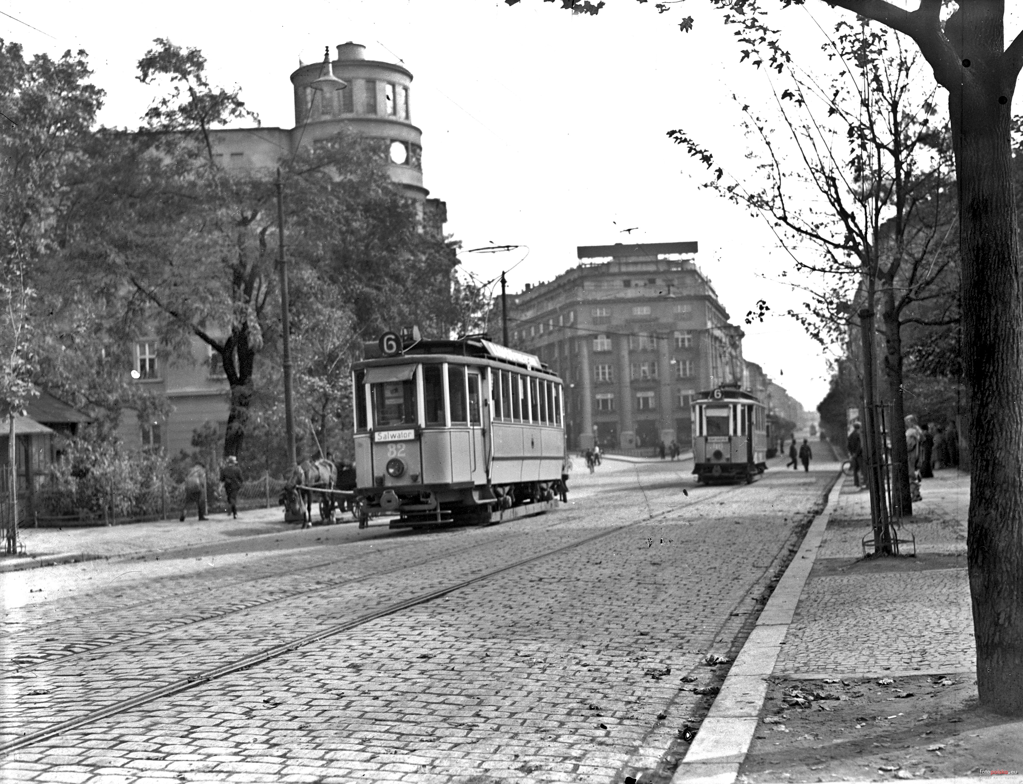 wrzesień 1936 , Tramwaje typu SN1 linii 6 u wylotu ulicy Siennej. W głębi widoczny Pałac Prasy i gmach Poczty Głównej.Skomentuj zdjęcie