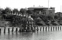 Kaskada wodna nad dużym stawem, a w głębi budynek cukierni