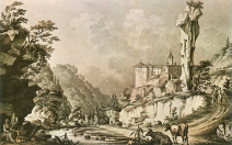 1787 , Dolina Prądnika z zamkiem w Pieskowej Skale. Akwarela Zygmunta Vogla z 1787 roku.Skomentuj zdjęcie