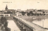 Tymczasowy most zbudowany w miejscu spalonego dn. 1.07.1905 r. mostu drewnianego. Z założenia miał funkcjonować znacznie krócej, ponieważ plany budowy nowego mostu były gotowe już w 1908 r. a ostatecznie jego byt trwał ok. 20 lat aż do wybudowania Mostu Gerloffa (dz. Staromiejskiego) o trwalszej konstrukcji żelbetowej, który stanął tuż obok, od strony zachodniej. Tymczasowa drewniana przeprawa została zaprojektowana przez Maxa Huhna i nosiła nazwę Mostu Warciańskiego (Warthebrücke).