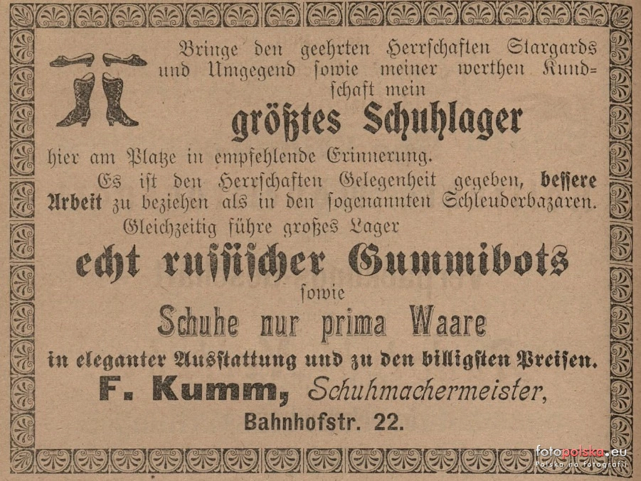 Panowie mają możliwość uzyskania lepszej pracy niż w tak zwanych "Schleuderbazaren". Jednocześnie mam duży zapas oryginalnych rosyjskich butów gumowych. Towary tylko pierwszej klasy w eleganckich wzorach i po najniższych cenach. F. Kumm, mistrz szewski,