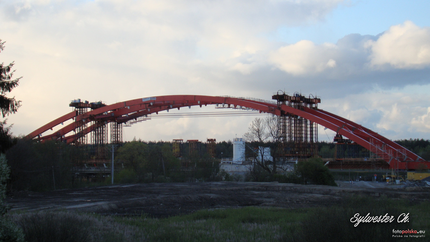 Naciąg ściągów (zewnętrzne dźwigary: 2 kable 12C15, wewnętrzny dźwigar: 4 kable 12C15) wykonywany był dwuetapowo: część siły wprowadzono, gdy łuk spoczywał na podporach tymczasowych. Docelową siłę wprowadzono, gdy łuk był już lekko uniesiony. Po wykonaniu pełnego naciągu ściągów (zakończone 6 maja br.), zrealizowano podnoszenie.