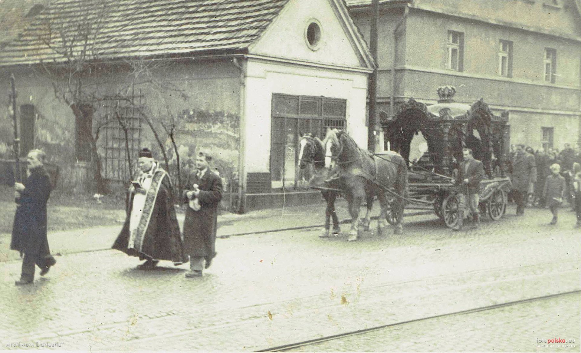 Lata 1950-1955 , Kondukt pogrzebowy na ulicy Cieplickiej- dokument epoki lat pięćdziesiątych XX wieku, ulica w kostce brukowej, widać tory tramwajowe,Skomentuj zdjęcie