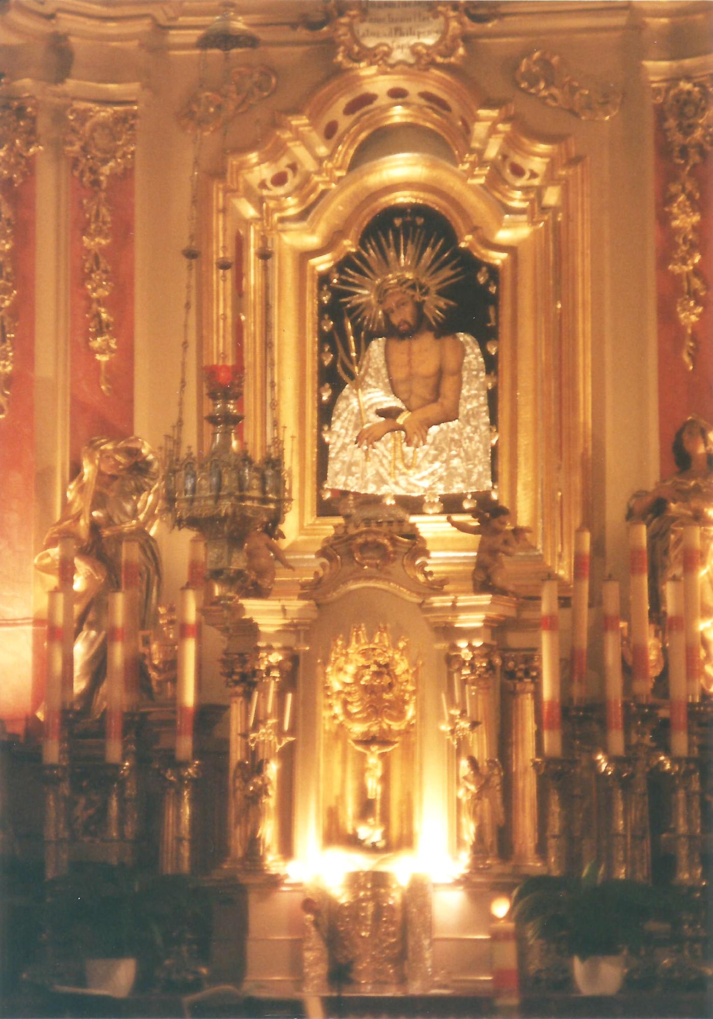 15 marca 1997 , Bielany. Sanktuarium Chrystusa Cierpiącego. Wnętrze. Obraz Chrystusa Ubiczowanego w głównym ołtarzu.Skomentuj zdjęcie |
