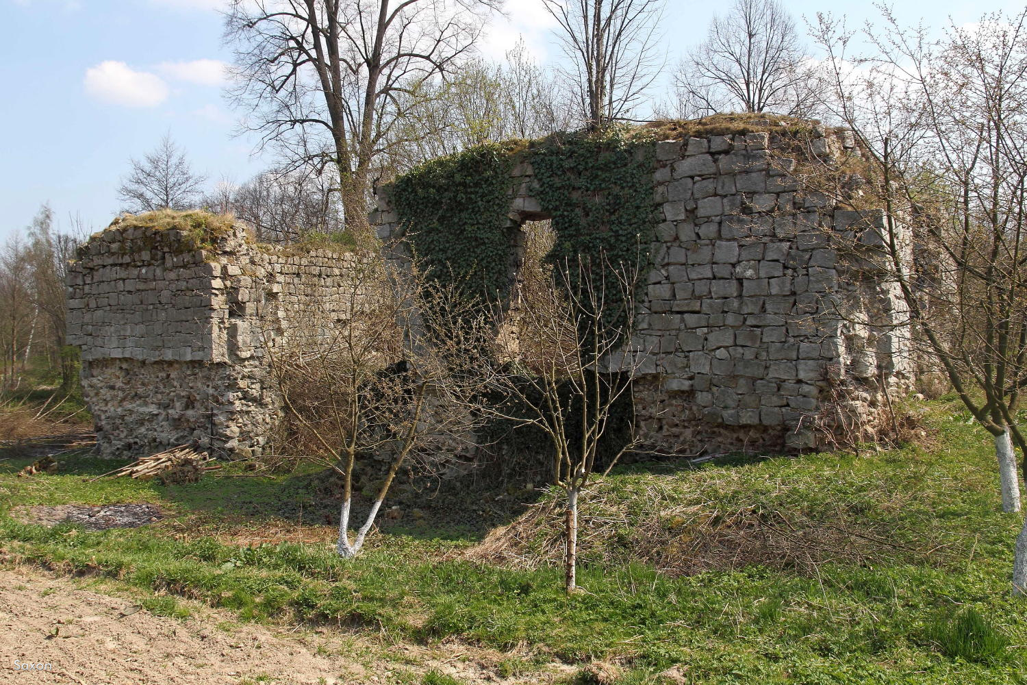 Pierwszym poświadczonym właścicielem wzmiankowanej już w drugiej dekadzie XIII stulecia wsi była rodzina Lange, która trzymała ją w posiadaniu na przełomie XIV i XV wieku. W późniejszym okresie miejscowość należała do rodu Raus-Sendorf (1421) oraz do rady miejskiej Lwówka, skąd w 1500 wykupił ją Siegmund von Zedlitz. On też w pierwszym kwartale XVI stulecia wzniósł na miejscu wcześniejszych umocnień regularny, nizinny zamek. Budowla zamieszkiwana była do połowy XVIII wieku; zniszczona podczas wojny trzydziestoletniej i ostatecznie opuszczona sto lat później, szybko popadła w ruinę.