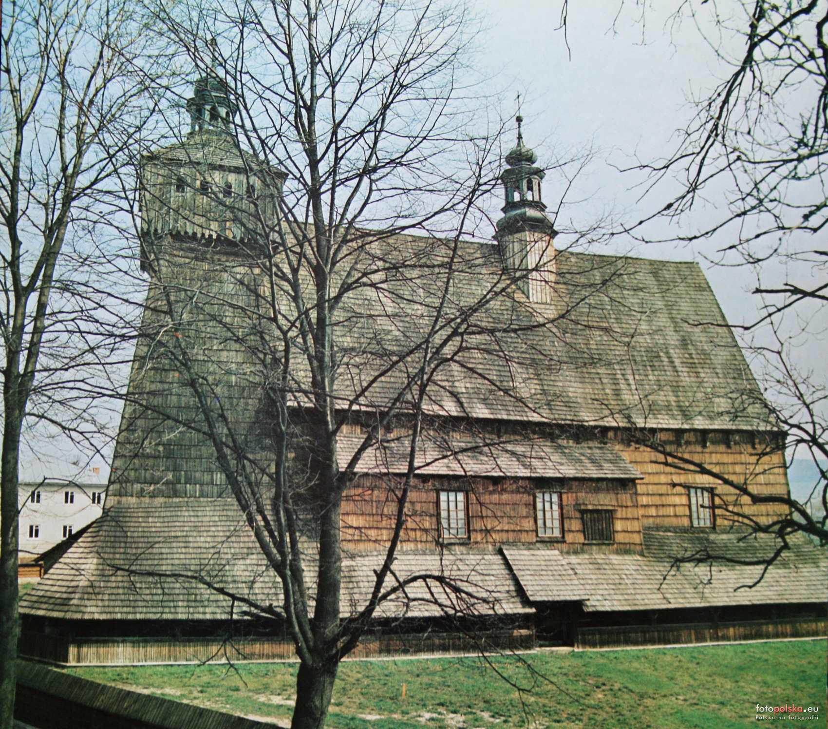 Drewniany, gotycki kościół o konstrukcji zrębowej, zbudowany pod koniec XIV w. Rozbudowany w 1624 r., kiedy to powstała wieża i wieżyczka na sygnaturkę, soboty, koliste otwory okienne w nawie i ziemny wał obronny. W latach 1784 – 1788 powiększono zakrystię i dobudowano nowe soboty. We wnętrzu unikalna polichromia figuralna z 1494 r. oraz późniejsza z ok. 1864 r.